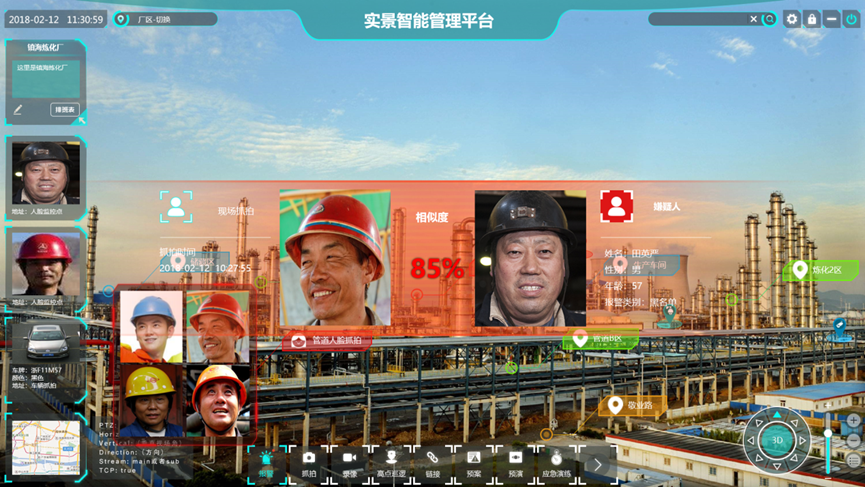 高点摄像机总览全局掌握厂区的总体安全生产状况,通过画中画调用卡口抓拍图片掌握厂区重点区域的作业人员的详细情况,支撑厂区对作业人员的可视化管理。同时,平台支持实时接收非厂区作业人员布控告警信号,一旦发现该人员不属于厂区作业人员,可在平台上同步弹窗告警提示。