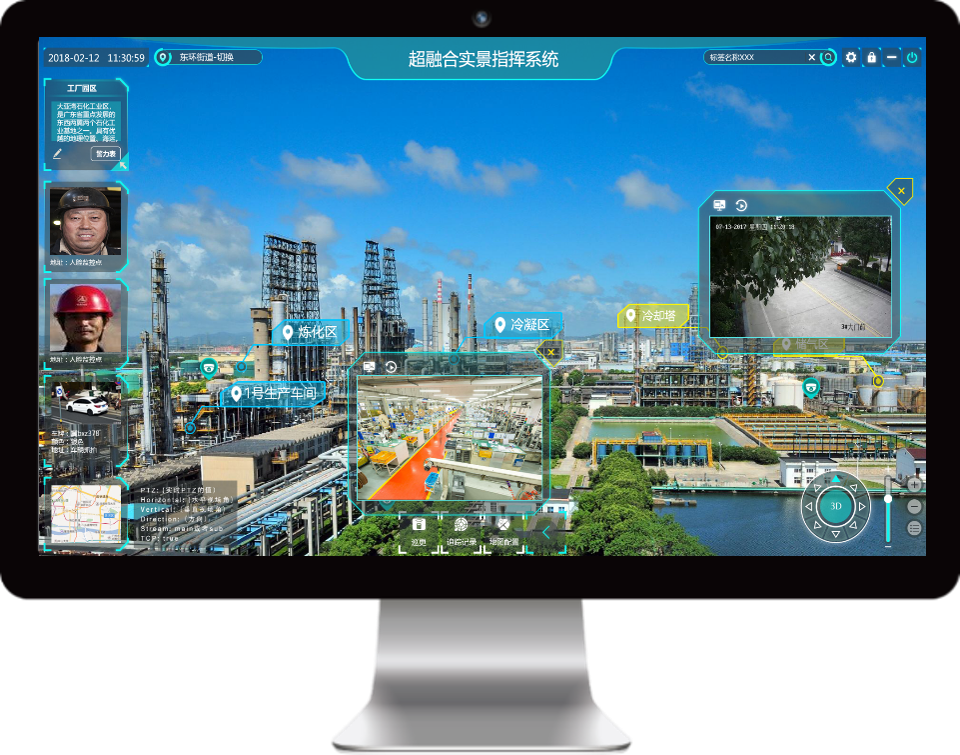 平台以高点视频画面为载体,运用高点监控采集的大范围、大场景监控画面,实现厂区整体态势监控,并且通过后台视频地图引擎和标签添加及交互功能,能够对厂区高点视频画面中的建筑、道路、摄像机、设施等进行实景标注,整体形成一张智慧化的视频实景地图。